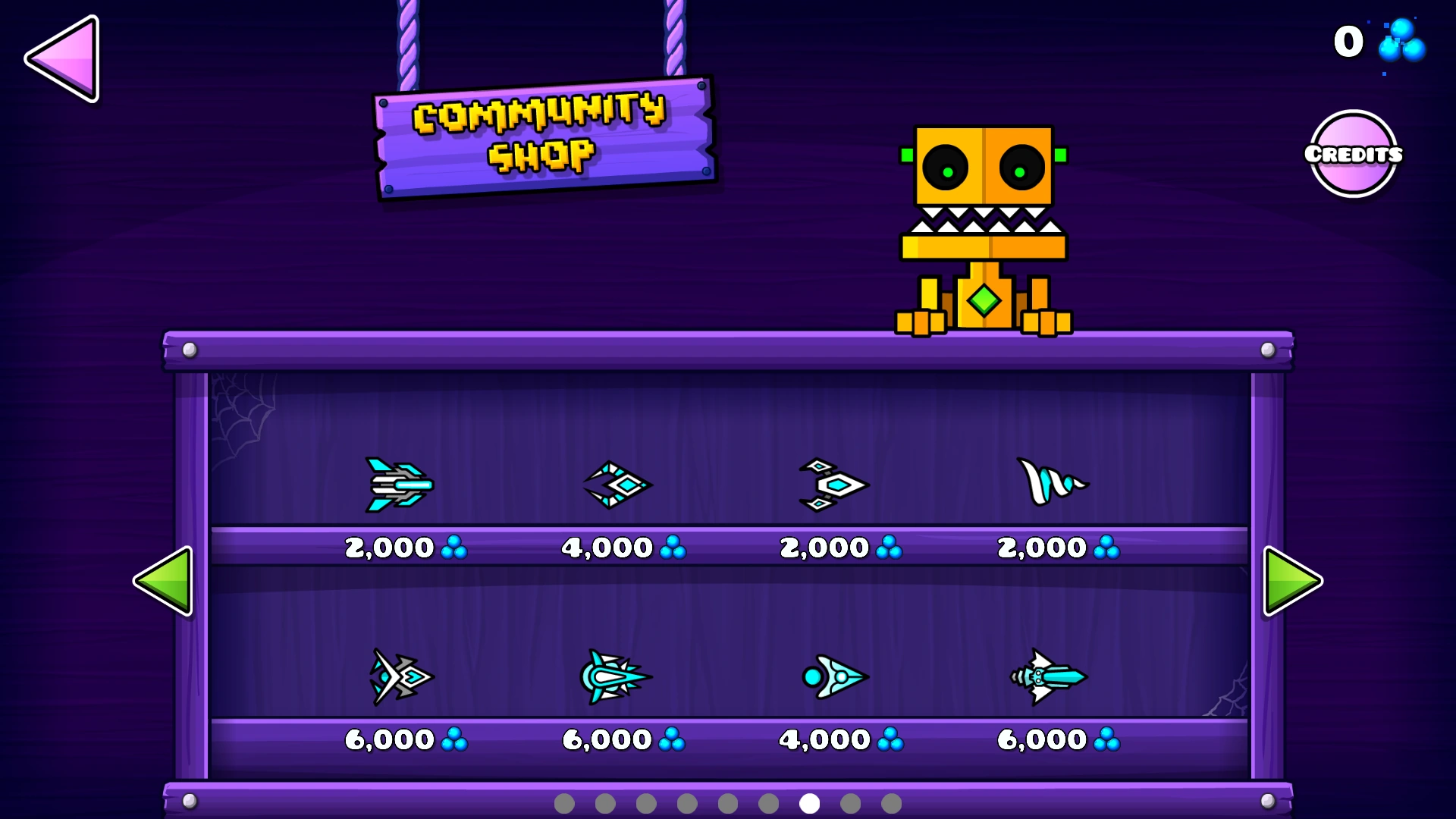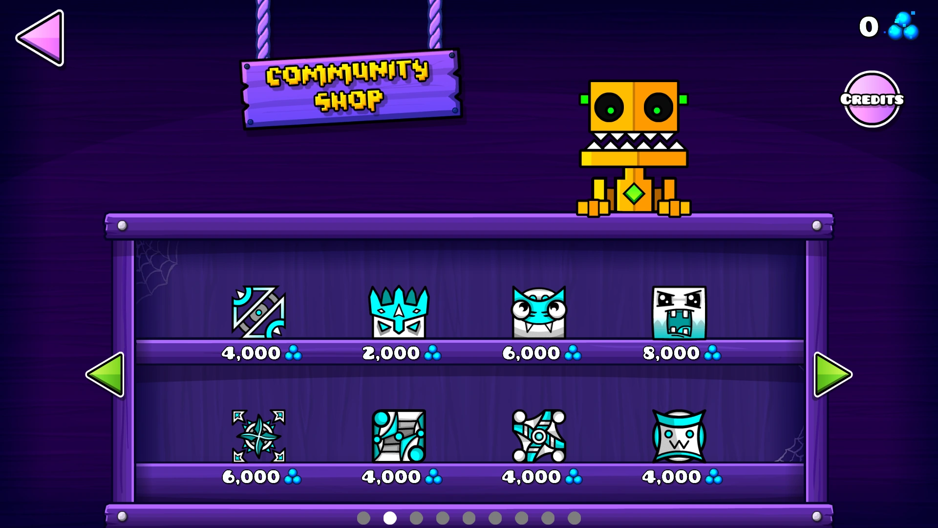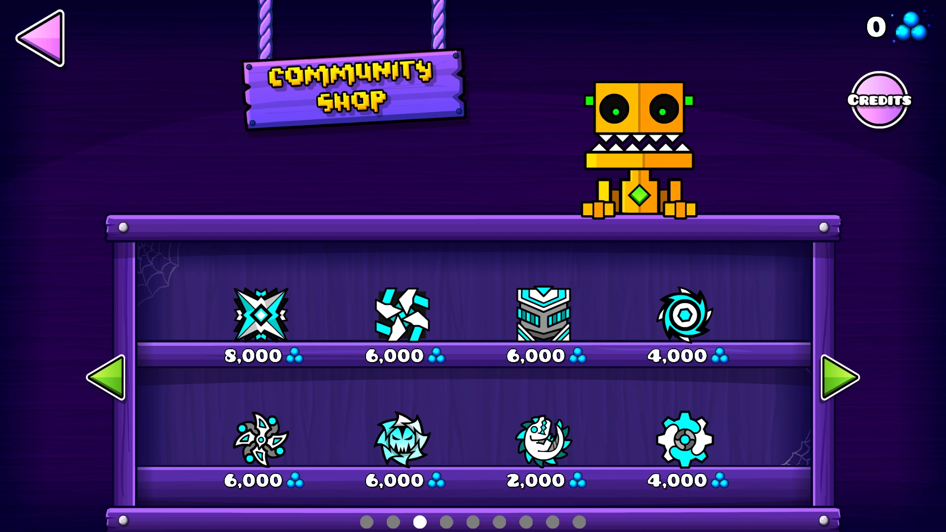 The Community Shop is a shop in Geometry Dash, Geometry Dash Lite, and Geometry Dash World, being introduced in Update 2.11. It is accessed by selecting the second hanging rope located on the last screen of the Treasure Room, requiring 200 diamonds to gain access.