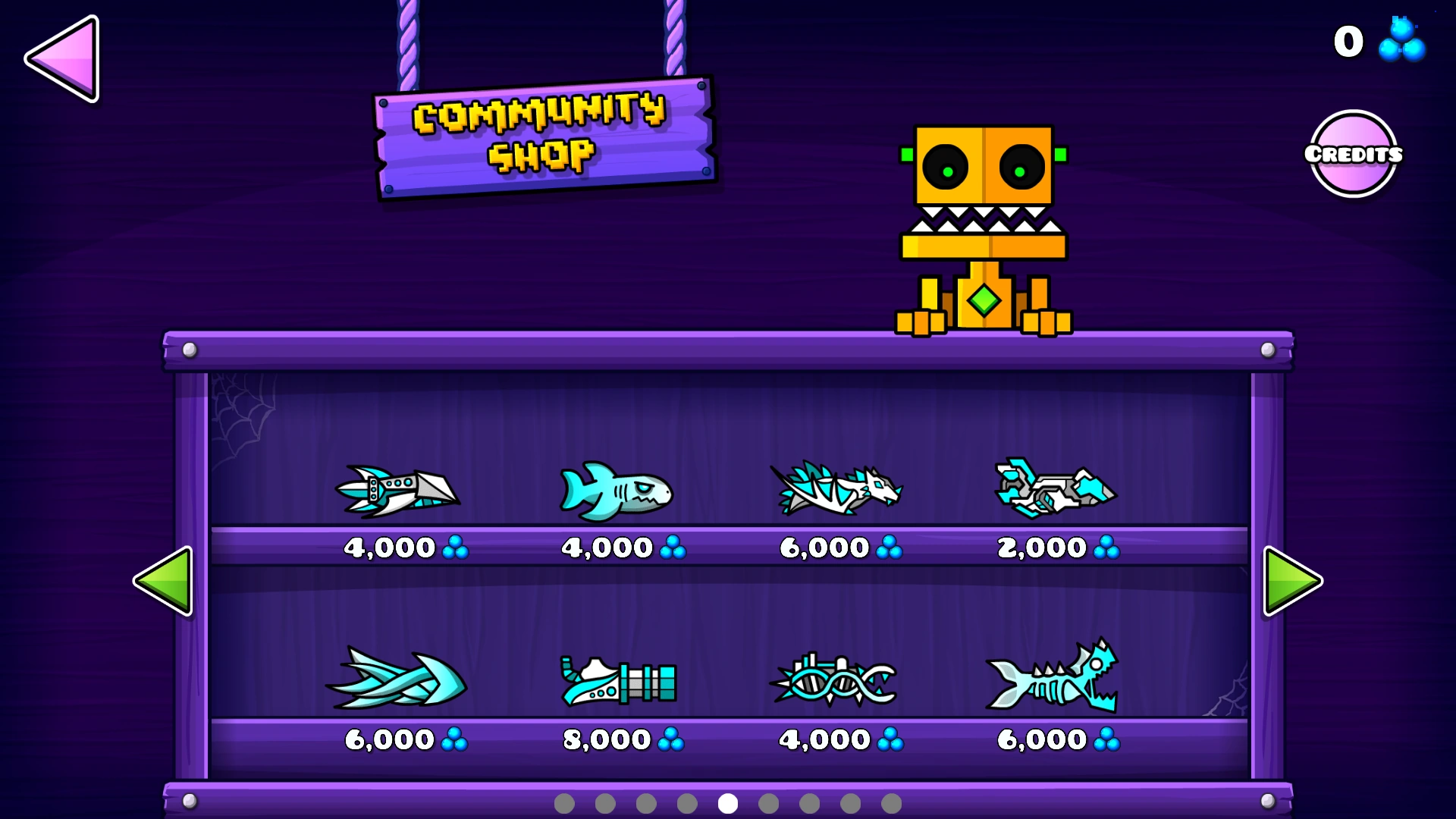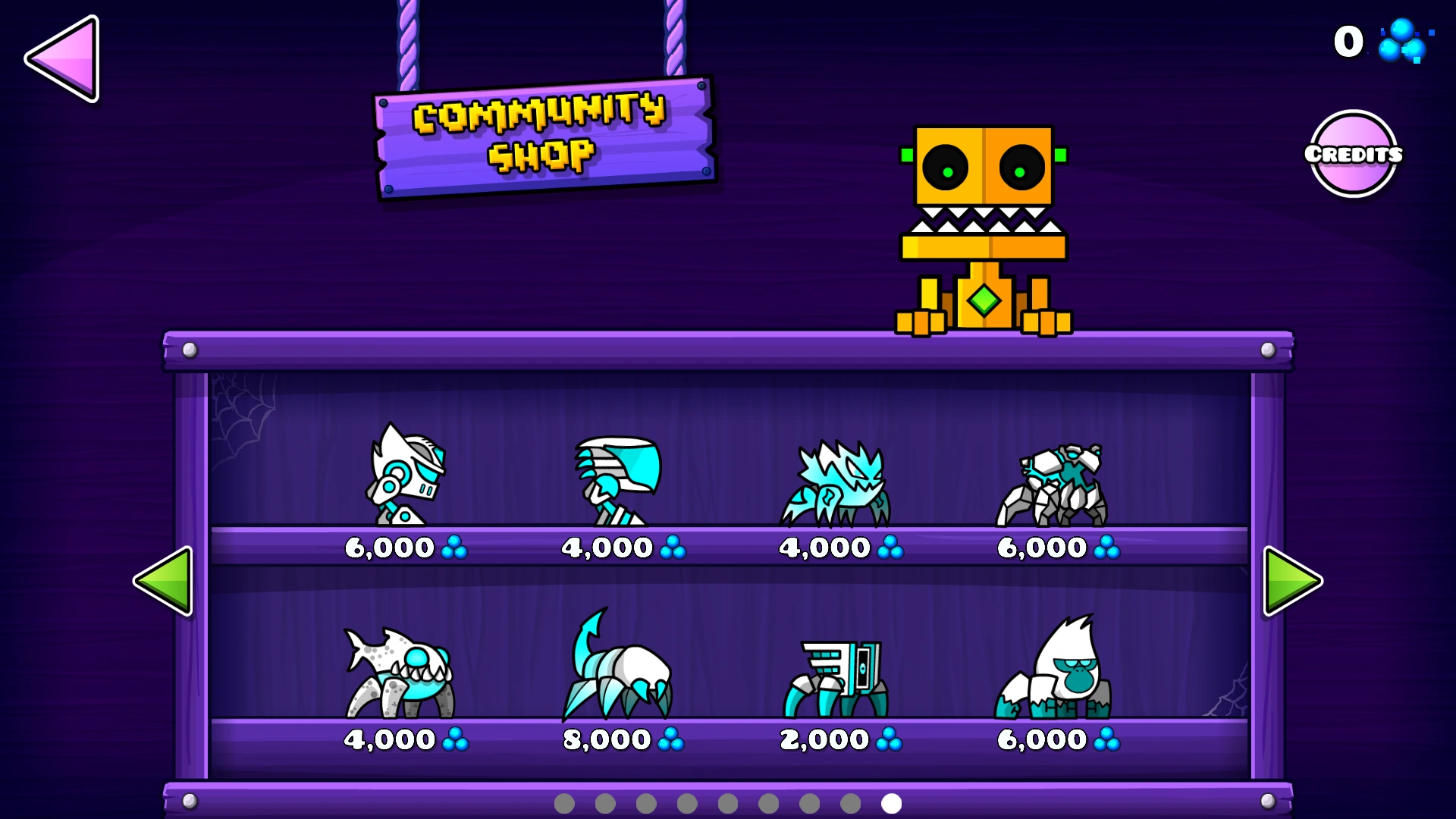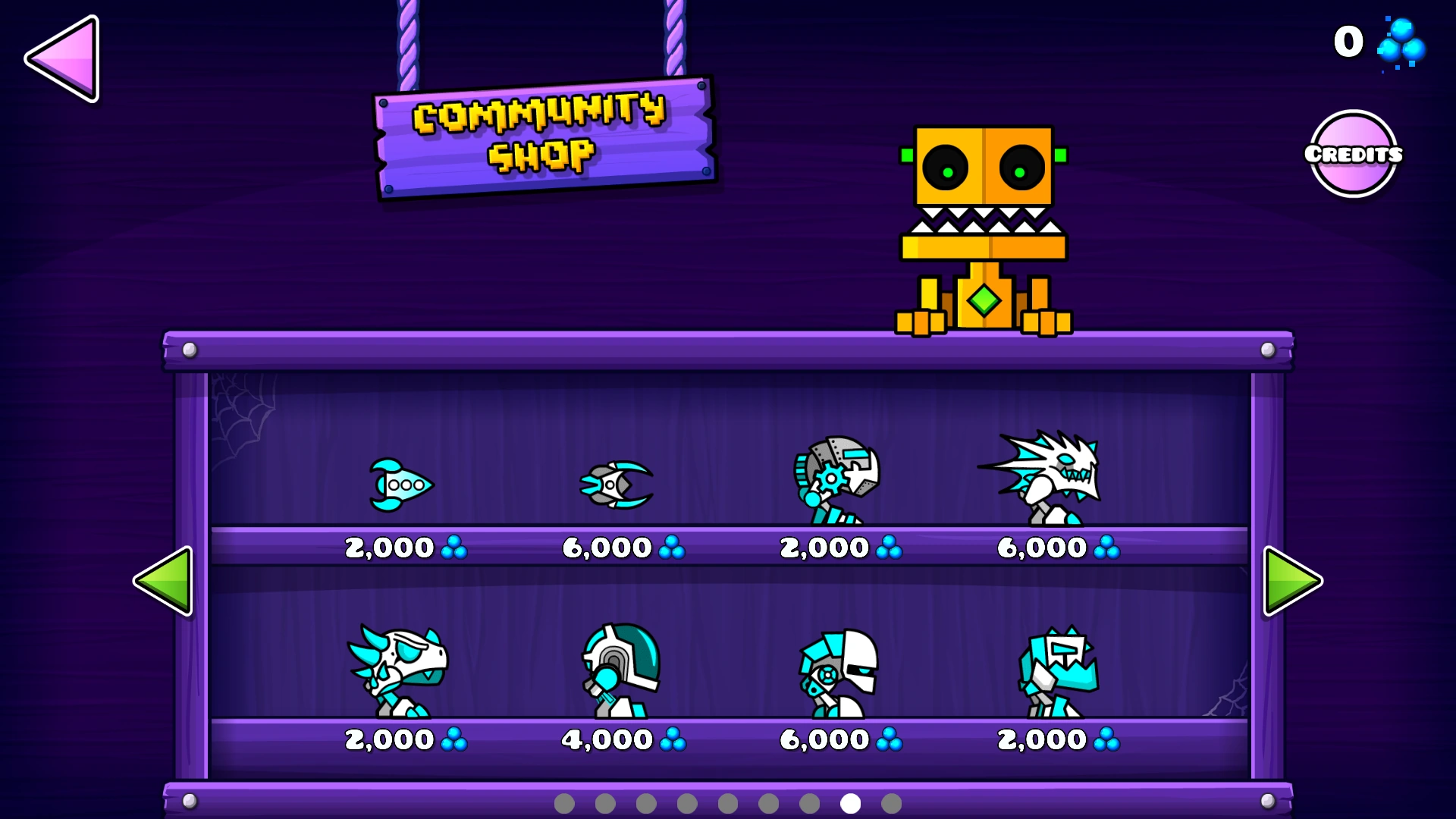 The Community Shop is a shop in Geometry Dash, Geometry Dash Lite, and Geometry Dash World, being introduced in Update 2.11. It is accessed by selecting the second hanging rope located on the last screen of the Treasure Room, requiring 200 diamonds to gain access.