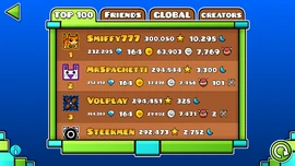 Leaderboards are a feature of Geometry Dash, Geometry Dash Lite, and Geometry Dash World, being introduced in Update 1.3.