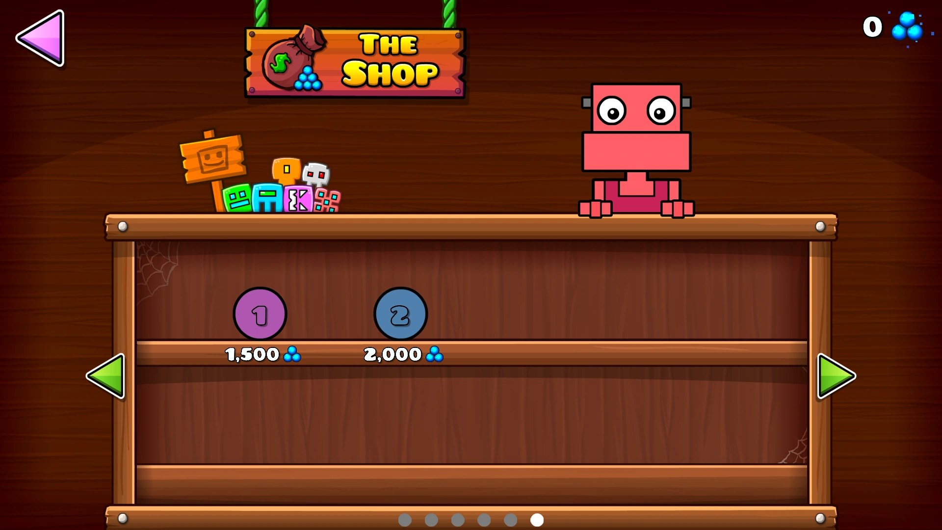 The Shop is a shop in Geometry Dash, Geometry Dash Lite, and Geometry Dash World, being introduced in Update 2.1. It is accessed by selecting a hanging rope located on the Icon Kit menu.